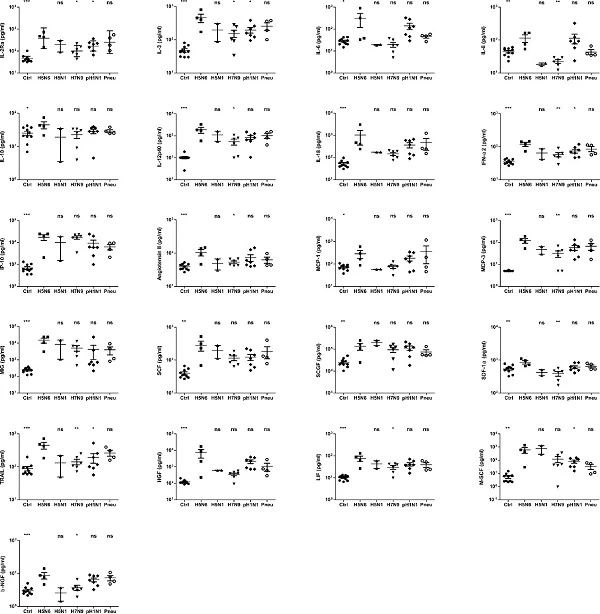 研究首先系統(tǒng)分析了19例H5N6感染病例的臨床特征。結(jié)果發(fā)現(xiàn),與H5N1和H7N9病毒感染相比較,H5N6病毒感染病例具有更高頻率淋巴細(xì)胞減少及較高的丙氨酸轉(zhuǎn)氨酶(ALT)和乳酸脫氫酶(LDH)水平。通過對血清中48種細(xì)胞因子/趨化因子的檢測,發(fā)現(xiàn)H5N6病毒感染呈現(xiàn)顯著的“細(xì)胞因子風(fēng)暴”特征,血清中多種因子的水平顯著高于H7N9、H5N1和pH1N1病毒感染病例及細(xì)菌性肺炎病例,包括IL-2Rα、IL-12p40、IL-18、IFN α2、IP-10等。進一步對兩例死亡病例和一例康復(fù)病例血清中細(xì)胞因子的動態(tài)變化進行了檢測,發(fā)現(xiàn)康復(fù)病例血清中細(xì)胞因子水平在感染后快速下降,而兩例死亡病例細(xì)胞因子持續(xù)處于高水平狀態(tài),提示持續(xù)高水平的細(xì)胞因子可能是造成H5N6病毒感染死亡的重要原因之一。