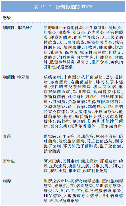總結(jié)過去20年來進(jìn)行的幾項FUO大型研究的結(jié)果。一般來說,感染占西方國家FUO的20%~25%。在西方國家以外的地區(qū),感染是FUO更常見原因(西方國家以外地區(qū)43%,西方國家22%),而由NIID和腫瘤引起的比例相似。西方國家以外地區(qū)的感染引起FUO患者中高達(dá)50%是由結(jié)核病引起的,結(jié)核病在美國和西歐并不常見。