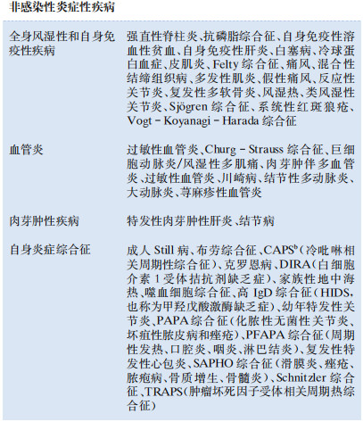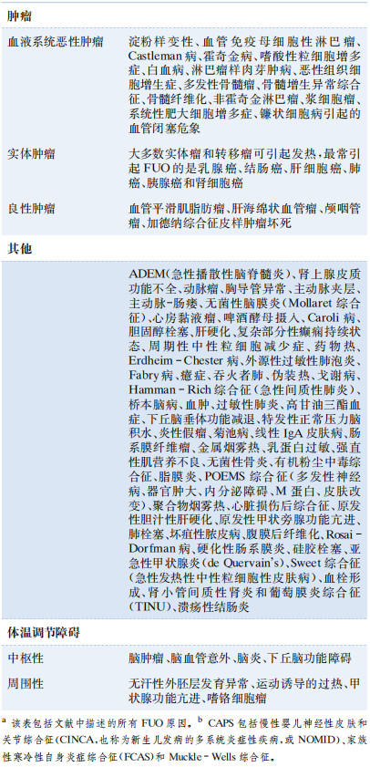 NIID患者中,大血管炎、風(fēng)濕性多肌痛、結(jié)節(jié)病、家族性地中海熱和成人Still病是FUO相當(dāng)常見的診斷。遺傳性自身炎癥綜合征非常罕見,通常年輕人多見。雖然大多數(shù)腫瘤都出現(xiàn)發(fā)熱,但迄今為止最常見的FUO腫瘤相關(guān)診斷是惡性淋巴瘤,有時發(fā)熱比體檢觸及淋巴結(jié)腫大更早出現(xiàn)。其他FUO原因中除了藥物引起的發(fā)熱和運動引起的過熱外都不常見。