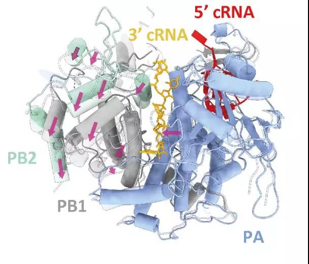 圖1:二聚體形式的人流感病毒(H3N2亞型)和禽流感病毒(H5N1亞型)RNA聚合酶