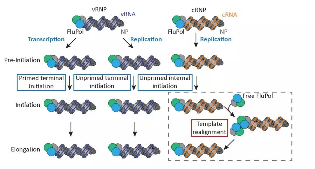 該研究揭示這兩種聚合酶有著高度類似的三維結(jié)構(gòu),它們會形成相似的二聚體(圖1)。針對二聚體結(jié)合面的關(guān)鍵氨基酸殘基的突變會抑制病毒基因的復(fù)制,并且是特異性地抑制vRNA的合成。這些結(jié)果表明流感病毒RNA聚合酶的二聚體結(jié)構(gòu)是病毒基因復(fù)制所不可缺少的。Ervin Fodor課題組此前曾經(jīng)報導(dǎo)流感病毒的基因復(fù)制需要通過一個游離的聚合酶來激活【11】。作者推測游離的聚合酶就是通過與包裝在RNP里的聚合酶形成這種二聚體,從而激活病毒基因的復(fù)制起始。