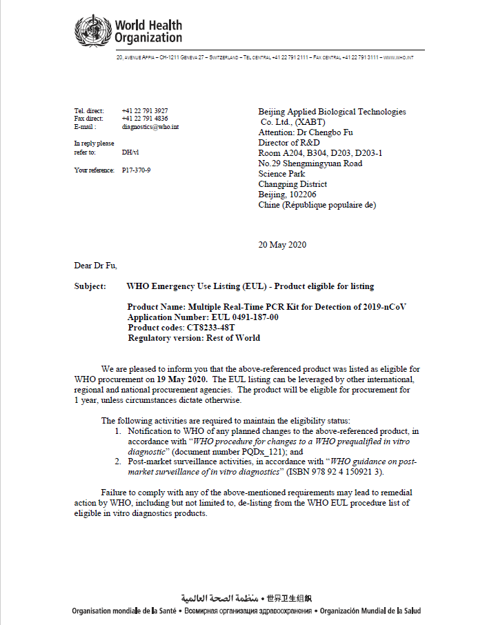北京卓誠(chéng)惠生生物科技股份有限公司新型冠狀病毒2019-nCoV核酸檢測(cè)試劑盒(熒光PCR法)于2020年5月19日正式被列入為世界衛(wèi)生組織(英文全稱(chēng)“World Health Organization”,以下簡(jiǎn)稱(chēng)“WHO”)應(yīng)急使用清單(英文全稱(chēng)“Emergency Use Listing”,以下簡(jiǎn)稱(chēng)“EUL”)??晒┢渌麌?guó)家和地區(qū)采購(gòu)。有效期限:如無(wú)特殊情況,該產(chǎn)品的采購(gòu)期限為1年。