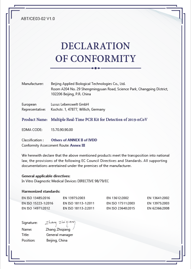 2020年2月27日,北京卓誠惠生生物科技股份有限公司與中國醫(yī)學科學院病原生物學研究所聯(lián)合研發(fā)的新型冠狀病毒2019-nCoV核酸檢測試劑盒(熒光PCR法)【國械注準20203400179】獲得國家藥品監(jiān)督管理局頒布的醫(yī)療器械注冊證。目前該產(chǎn)品已完成歐盟地區(qū)準入,可向歐盟市場供應。