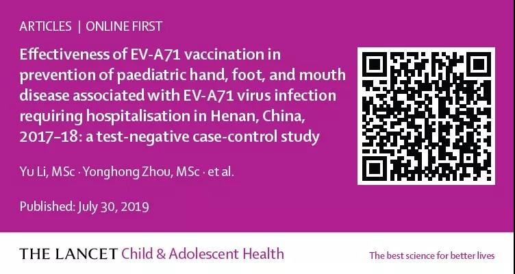 《柳葉刀-兒童與青少年健康》(The Lancet Child & Adolescent Health)近日在線發(fā)表一篇有關EV-A71疫苗上市后效果研究的論文,本研究由復旦大學公共衛(wèi)生學院余宏杰教授課題組完成。研究發(fā)現,EV-A71疫苗可有效預防6-71月齡兒童感染EV-A71引起的非重癥手足口病,全程兩劑次EV-A71疫苗可有效預防EV-A71相關手足口病,未發(fā)現EV-A71疫苗可預防CV-A6或CV-A16相關手足口病。