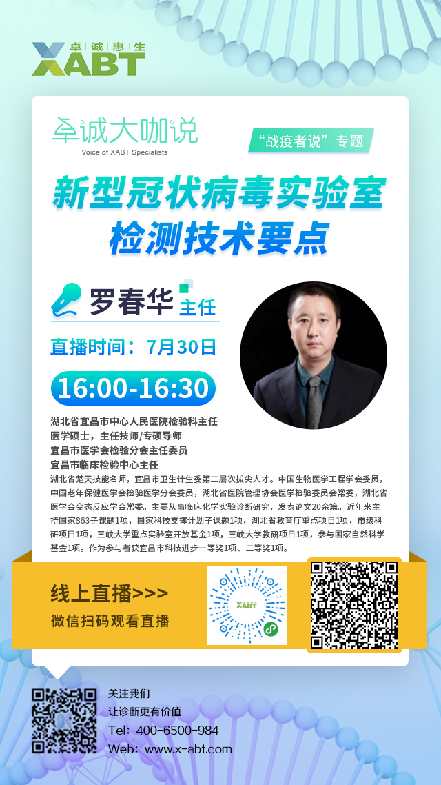 卓誠大咖說之“戰(zhàn)疫者說”專題第四期將于7月30日16:00正式開播,我們非常榮幸邀請到湖北省宜昌市中心人民醫(yī)院檢驗科羅春華主任為我們帶來《新型冠狀病毒實驗室檢測技術(shù)要點》的主題講座,期待各位屆時蒞臨直播間,共同學習,互相啟發(fā)!