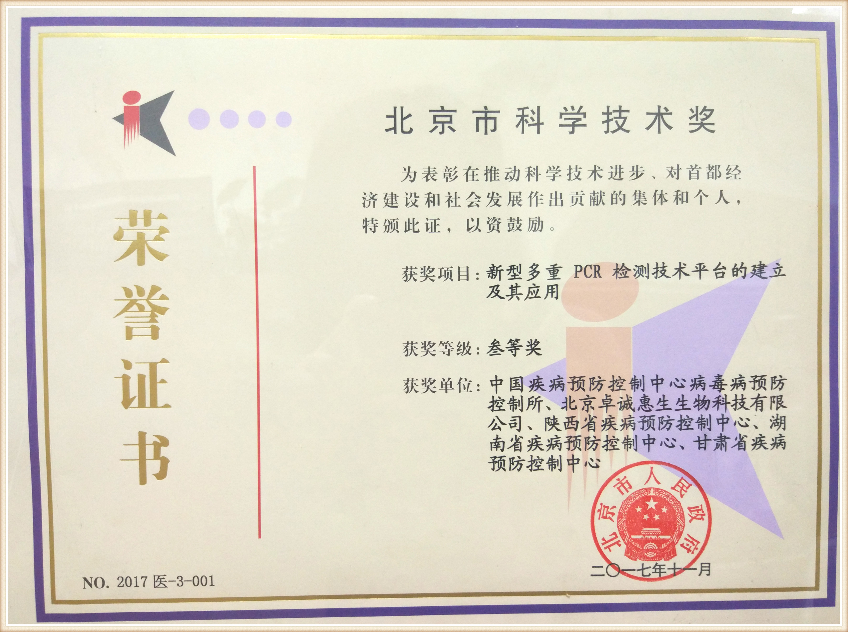 為表彰在2017年推動科學技術進步,對首都經(jīng)濟建設和社會發(fā)展作出貢獻的集體和個人,北京市人民政府于2017年11月為北京卓誠惠生參與完成的“新型多重PCR檢測技術平臺的建立及其應用”項目頒發(fā)北京市科學技術獎叁等獎,以資鼓勵。